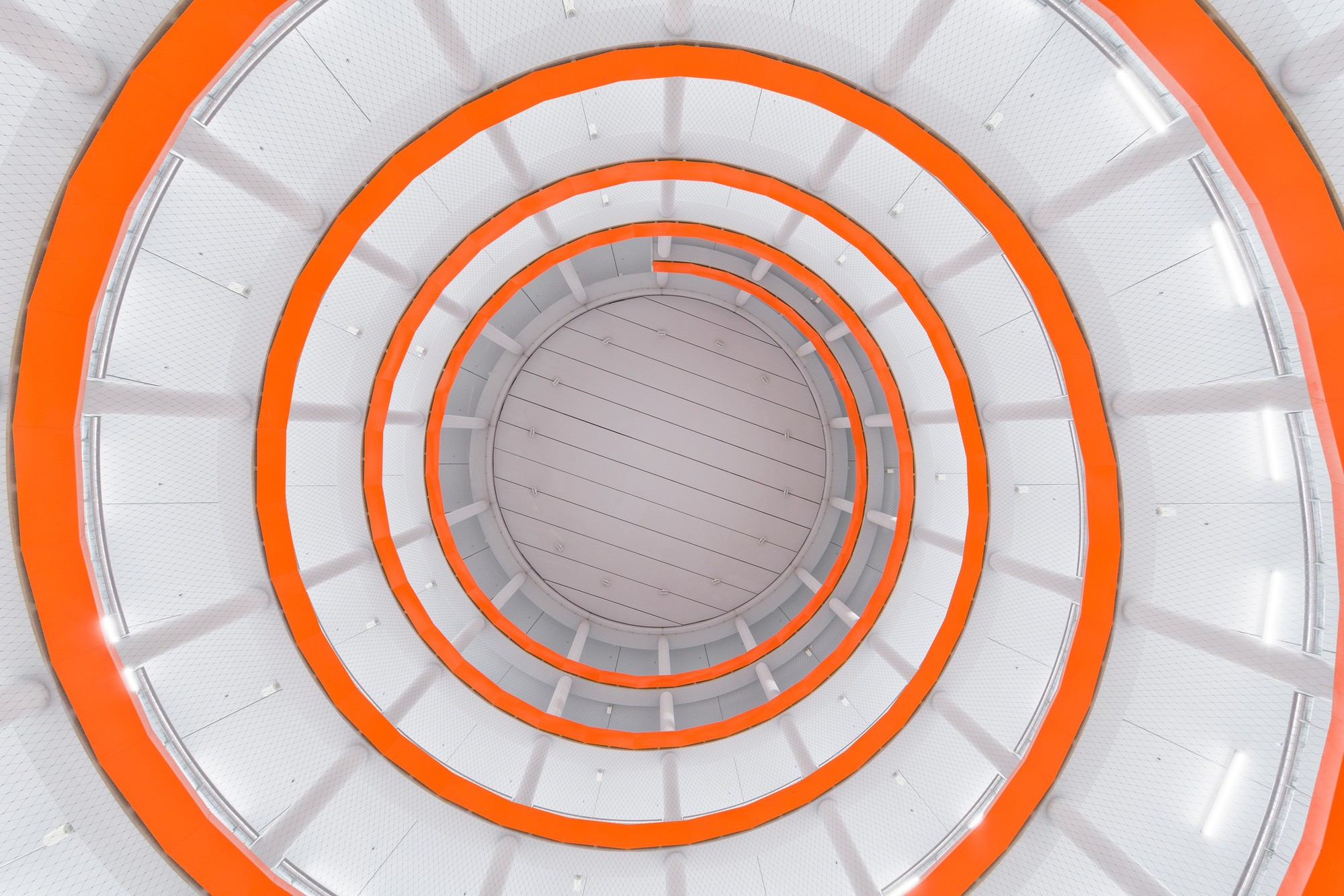 주차 공간 뒷벽의 주황색 벽면에는 예술작품이 반 층마다 설치되어 있습니다.